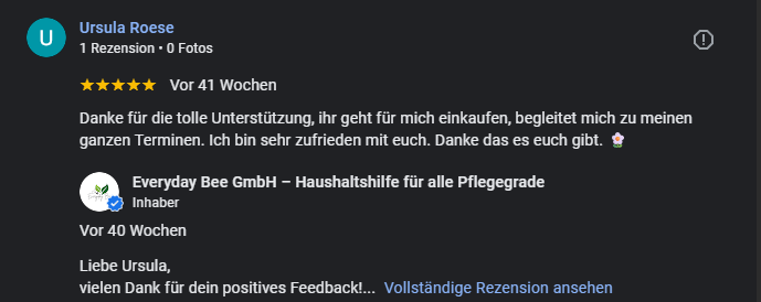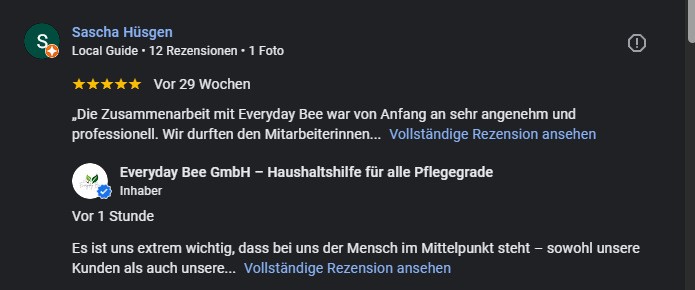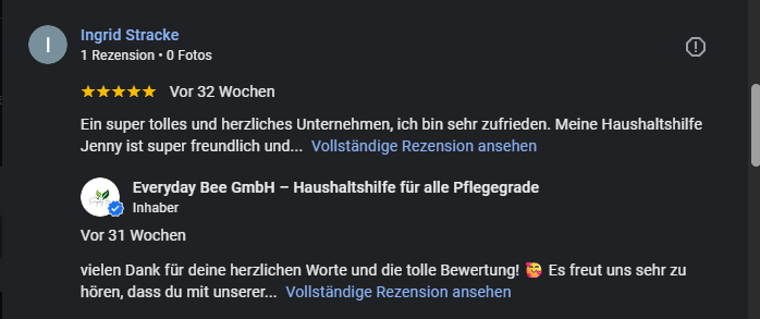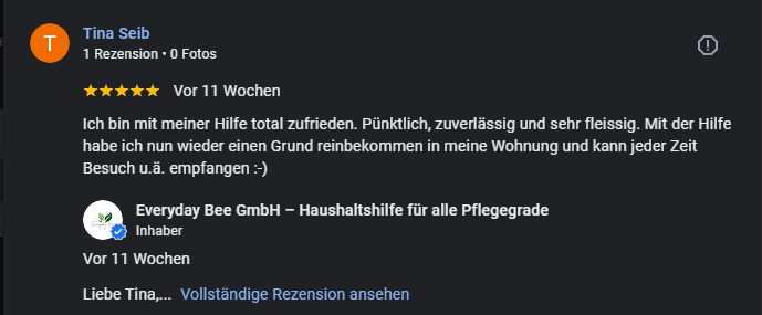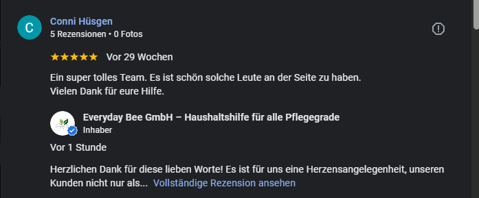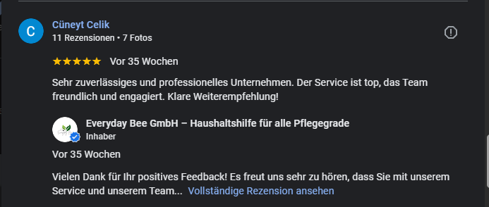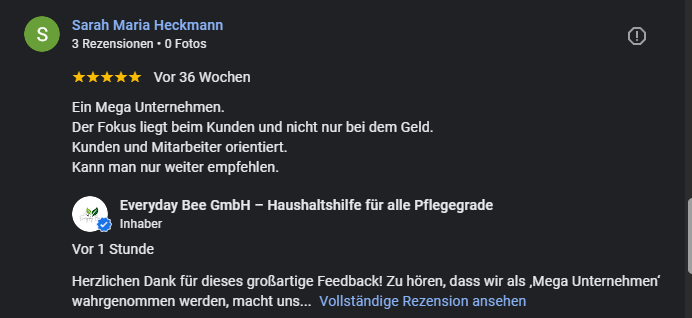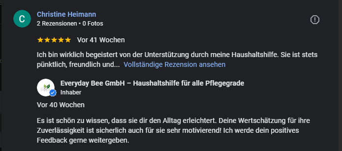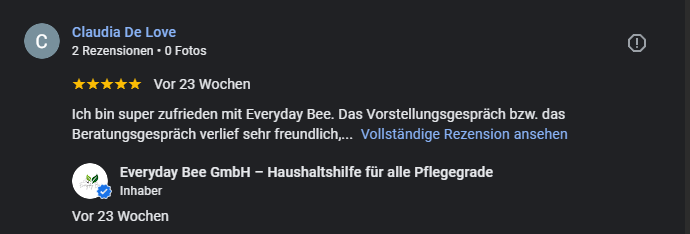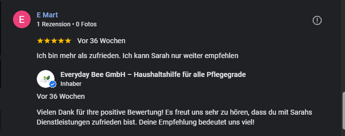 Vertrauen ist die Basis unserer Arbeit. Erfahren Sie hier aus erster Hand, wie wir Familien in ganz NRW im Alltag entlasten. Wir sind stolz auf das ehrliche Feedback unserer Klienten, denn es motiviert unser Team von Everyday Bee, jeden Tag das Beste zu geben.
