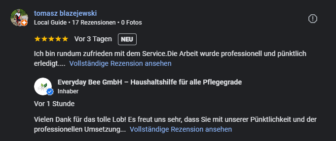 Hier finden Sie einen Auszug unserer aktuellen Google-Rezensionen. Transparenz und Zufriedenheit stehen für uns an erster Stelle.